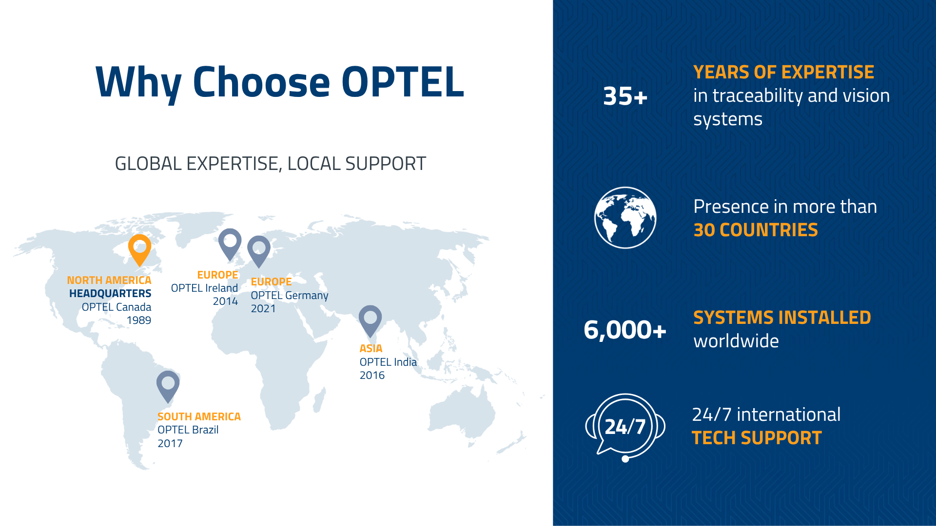 With decades of traceability and vision experience and 24/7 international tech support, OPTEL brings hands-on help wherever you manufacture or distribute.