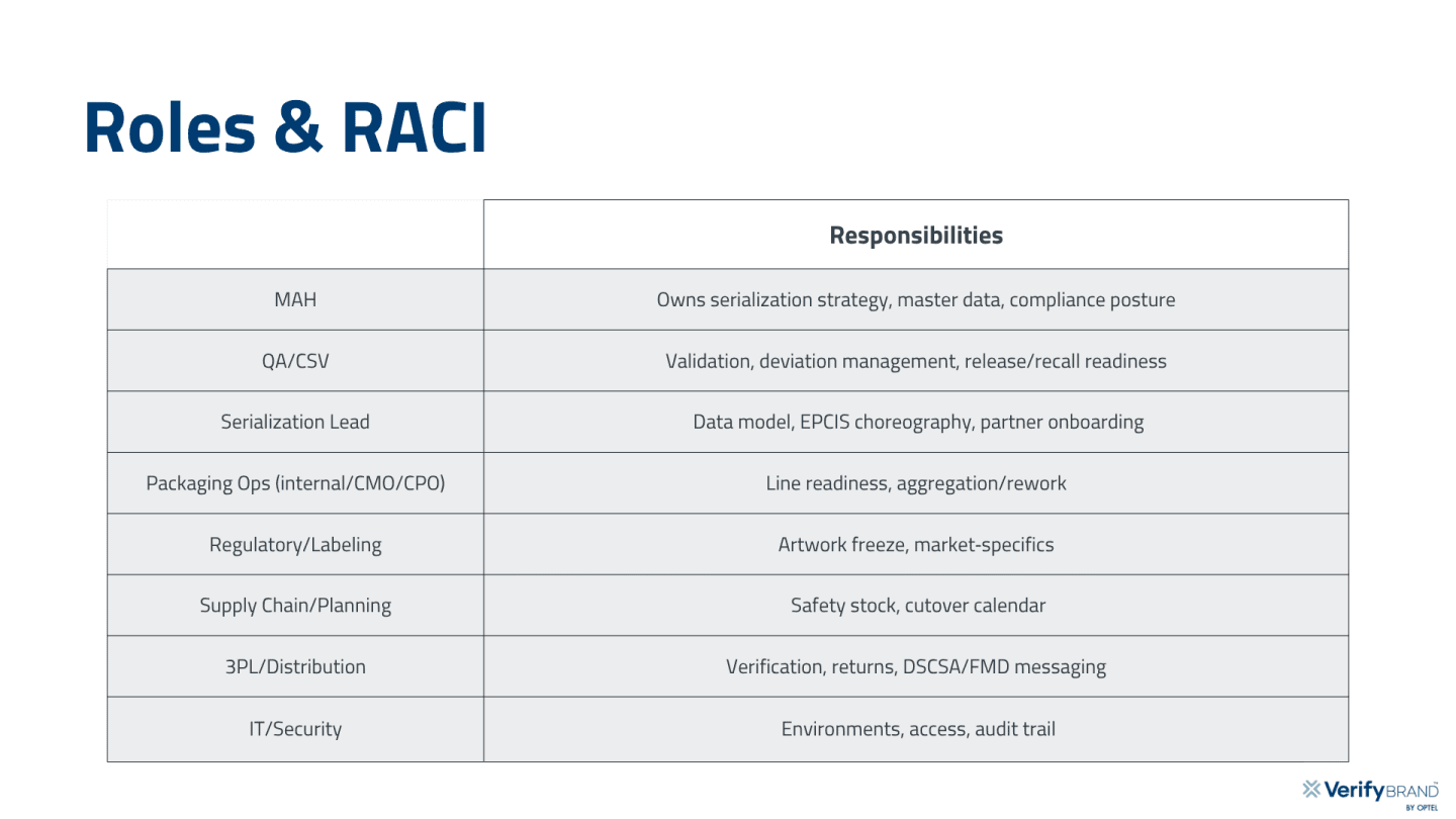 Before you green-light commercial lots, your program should have: serialization decisions locked, partners exchanging EPCIS, artwork controls aligned with serialized packaging, validation complete, a realistic end-to-end Test Run executed, and a sequenced go-live plan. (See the executive summary for the complete checklist)