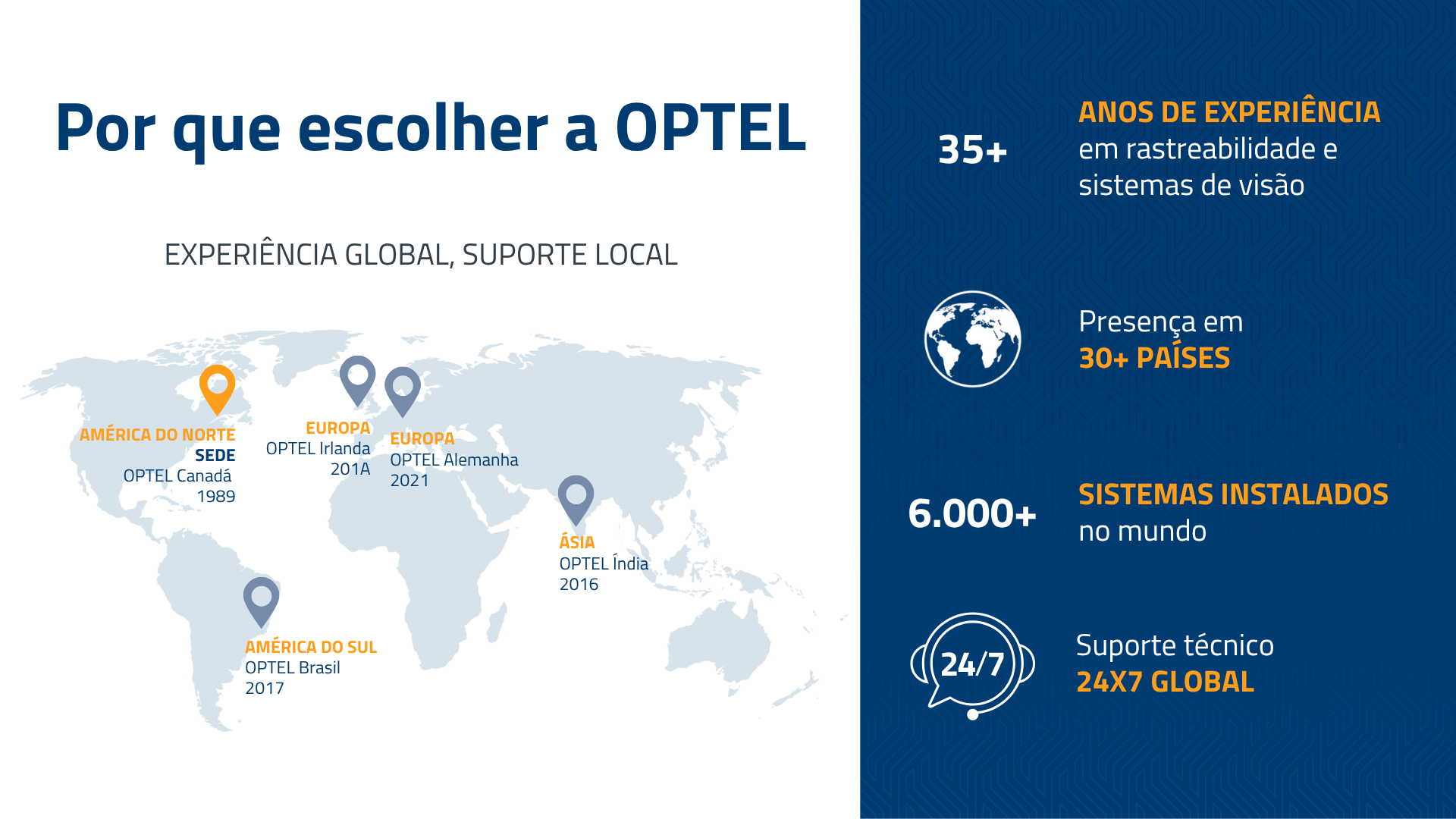 Com décadas de experiência em rastreabilidade e visão e suporte técnico internacional 24/7, a OPTEL oferece ajuda prática onde quer que você fabrique ou distribua.